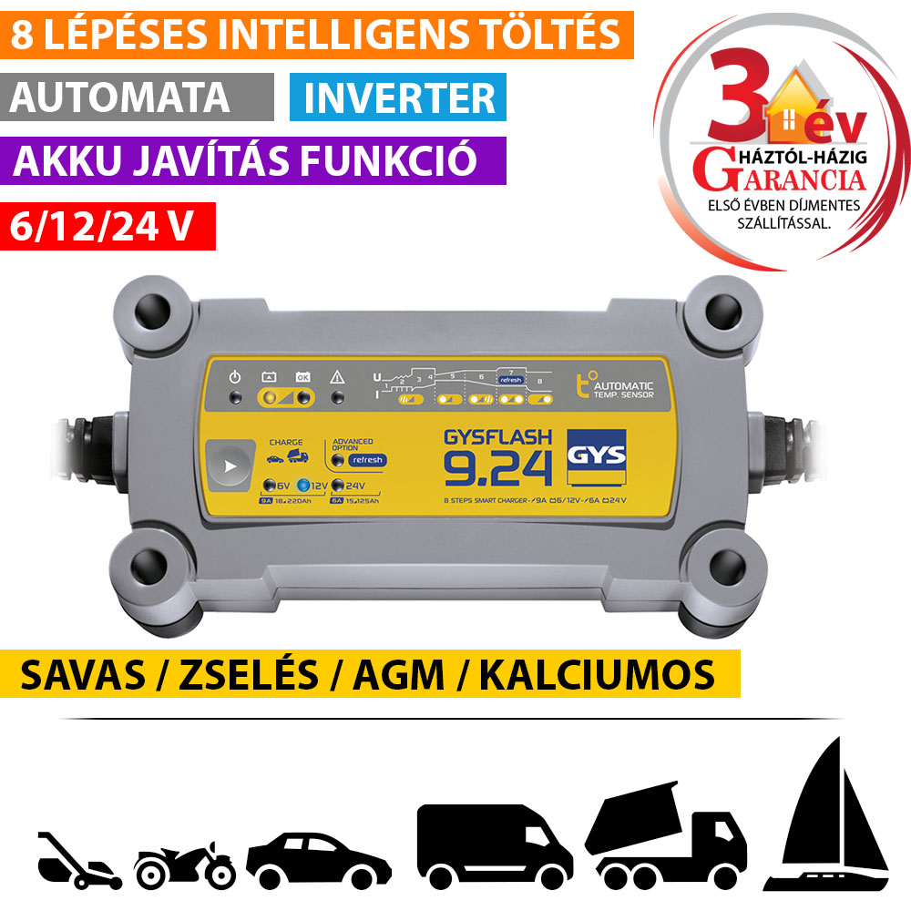 A GYSFLASH 9.24 kifejezetten az összes jármű 6, 12 és 24 V-os akkumulátorának töltésére lett kifejlesztve. 8 lépéses, intelligens töltési görbével rendelkezik, valamint «Refresh» móddal az erősen lemerült akkumulátorok helyreállítására.
