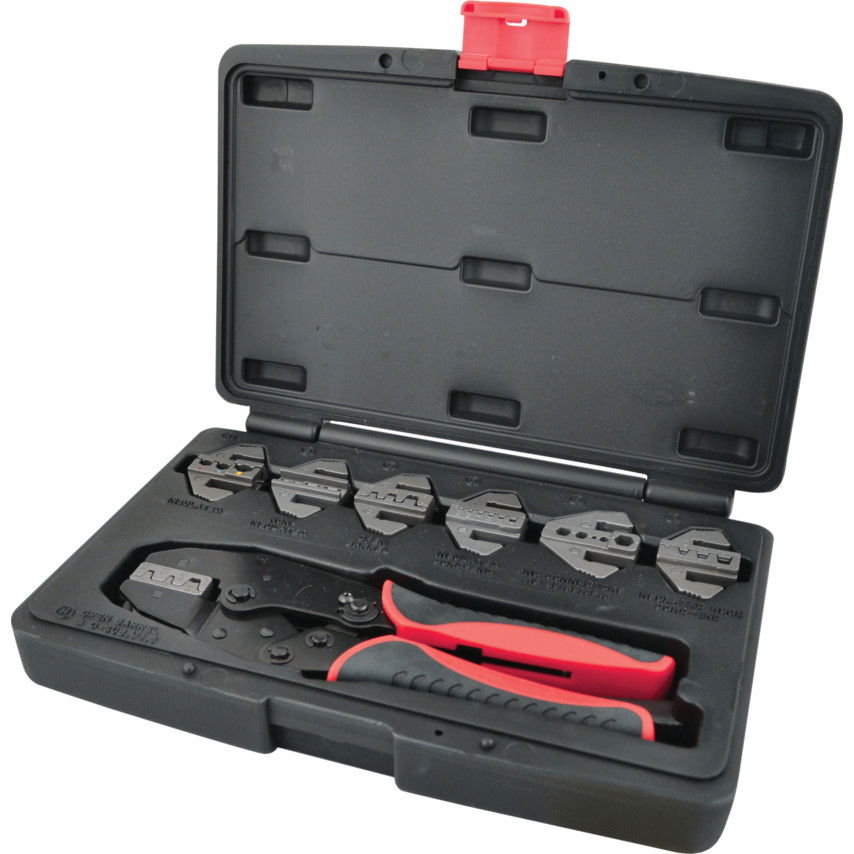Könnyedén cserélhető pofákkal ellátott saruzó fogó, reteszelt préskerettel és állítható présnyomással. Öt cseréhető edzett és megeresztett karbonacél pofa, kábelsarukhoz, csatlakozókhoz, csőhüvelyekhez és záróhüvelyekhez. Ütésálló műanyag hordtáskában.